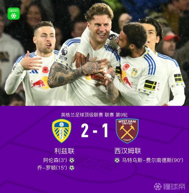 利兹联2-1送西汉姆联连续6轮不胜,阿伦森闪击,乔-罗顿破门